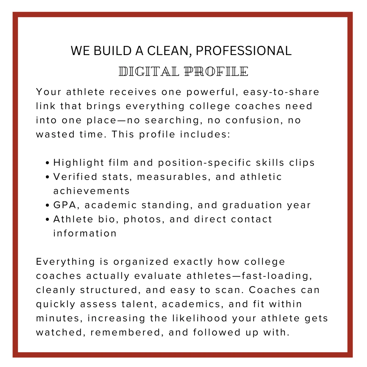 We shape your film, stats, and story into a clean, coach-ready profile that captures attention in seconds. Our process highlights your athlete’s best work so college coaches can quickly see their potential, passion, and path to the next level.
