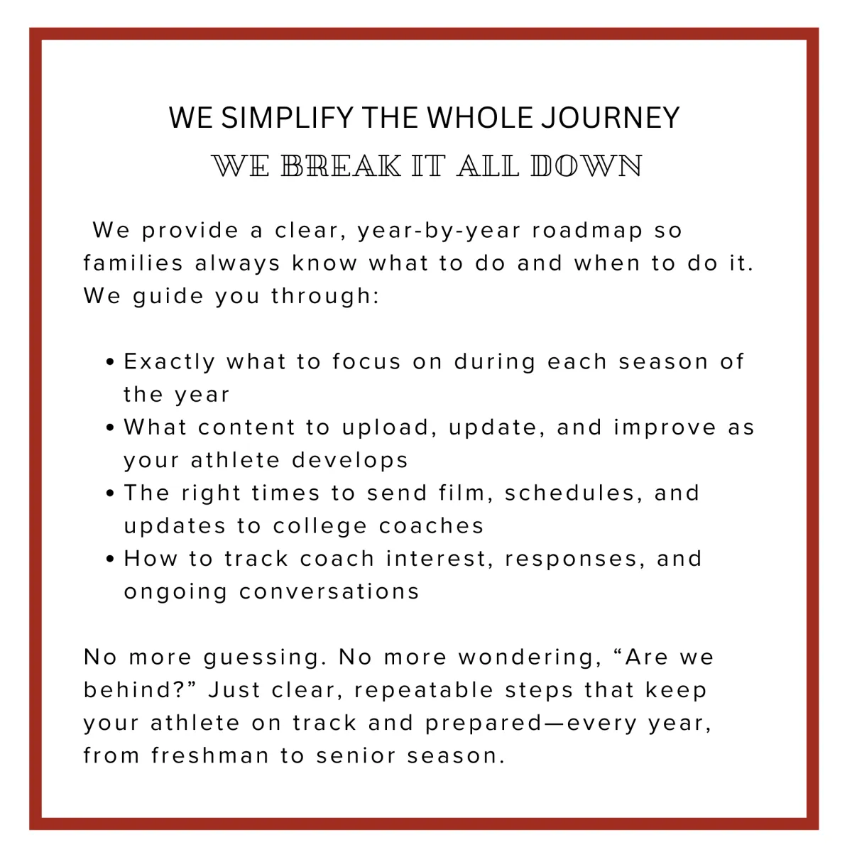 Athlete’s Edge Recruiting gives your family a step-by-step roadmap for each grade level—freshman through senior year. Your athlete will know exactly what to do, when to do it, and what to send, so their effort is focused, intentional, and aligned with how college coaches actually recruit.
